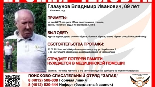 В Калининграде ищут 69-летнего Владимира Глазунова. Мужчина страдает потерей памяти и нуждается в медицинской помощи, сообщает ПСО "Запад".