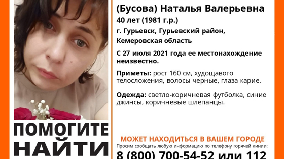 Приметы жительницы Гурьевска: рост 160 см, худощавое телосложение, черные волосы и карие глаза. Когда ее видели в последний раз, была одета в светло-коричневую футболку, синие джинсы, коричневые шлепанцы.
