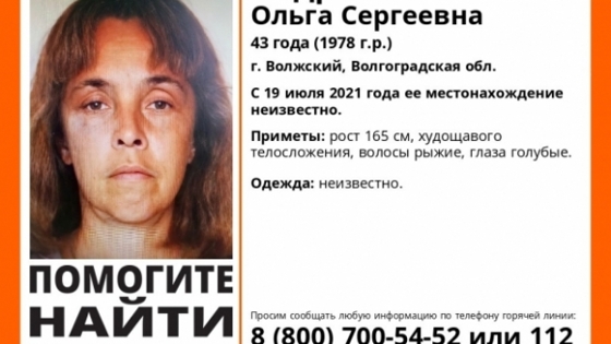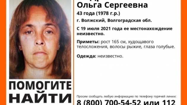 В Волгоградской области пропала женщина, информации о ее местонахождении нет с 19 июля. Проживающая в городе Волжском 43-летняя Андреева Ольга Сергеевна пропала почти полтора месяца назад. К ее поискам подключились добровольцы. Рост женщины составляет 165 см. У нее худощавое телосложение и рыжие волосы, а также голубые глаза. Во что была одета Ольга – неизвестно. Информацию о местоположении женщины можно сообщить полиции по телефону 112. Также есть возможность связаться с волонтерами по номеру 8-800-700-54-52. Марк Полубинскас. © Фото: поисковый отряд «Лиза Алерт».