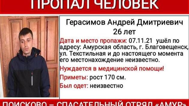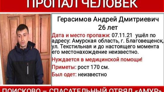Согласно ориентировке, Андрей Герасимов 7 ноября ушёл из дома на улице Текстильной в Благовещенске. Во что он был одет, неизвестно, ярких отличительных примет у молодого человека нет. Уточняется лишь, что он среднего роста – 170 см.