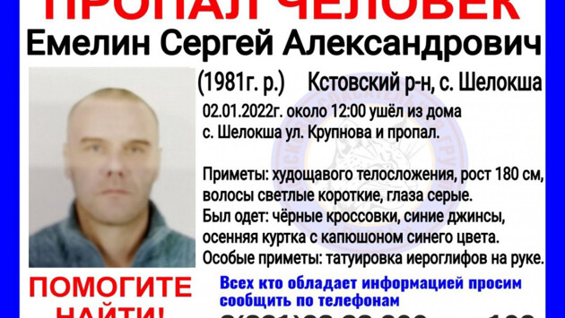 2 января около 12:00 мужчина ушел из дома на улице Крупнова в селе Шелокша, однако обратно не вернулся.