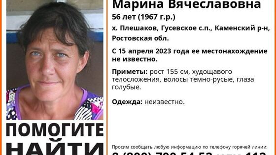 Ростовская область, 20 апреля 2023. DON24.RU. В Каменском районе разыскивают жительницу хутора Плешакова 56-летнюю Марину Соболеву. Ее местонахождение неизвестно с 15 апреля, сообщили в поисковом объединении «ЛизаАлерт». Приметы пропавшей: рост 155 см, худощавого телосложения, волосы темно-русые, глаза голубые. В чем была одета – неизвестно. Любую информацию об этой женщине просьба сообщить по телефонам: 8 (800) 700-54-52 или 112.