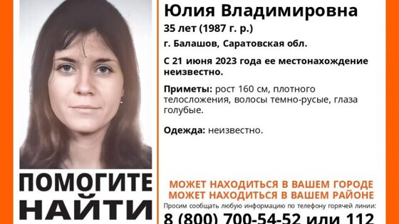 В Балашове ищут пропавшую 35-летнюю местную жительницу Юлию Рекечинскую. Как сообщили в поисковом отряде «Лиза Алерт Саратов», горожанка перестала выходить на связь с родными с 21 июня. Из особых примет жительницы райцентра сообщаются: рост 160 см, плотного телосложения, волосы темно-русые, глаза голубые. Всех, кто знает о ее местонахождении, просят позвонить по номеру: 8-800-700-54-52 или 112.