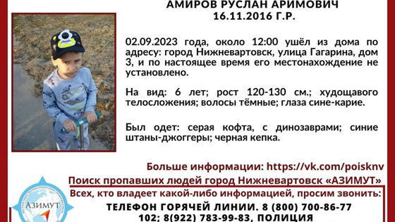 «Амиров Руслан, 2016 года рождения. 2 сентября около 12:00 он ушел из дома по адресу: Нижневартовск, улица Гагарина, дом 3. В настоящее время его местонахождение неизвестно», — сообщается в группе «Поиск пропавших людей „АЗИМУТ“ г. Нижневартовск» в соцсети «ВКонтакте».