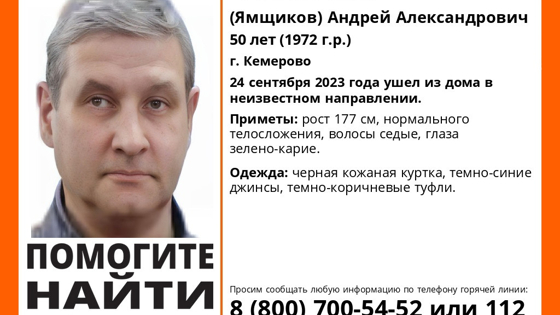 ПСО "Лиза Алерт" сообщил об исчезновении 50-летнего жителя Кемерова. 24 сентября Милованов (Ямщиков) Андрей Александрович ушел из дома в неизвестном направлении.