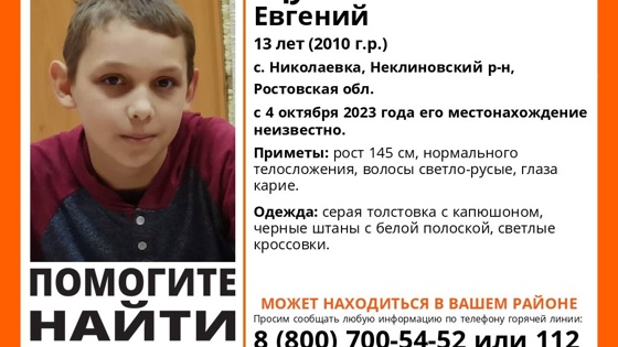 Ростовская область, 5 октября 2023. DON24.RU. В Ростовской области пропал 13-летний Евгений Щукин. Как сообщили в группе поискового отряда «ЛизаАлерт», с 4 октября 2023 года его местонахождение неизвестно. Его приметы: рост 145 см, нормального телосложения, волосы светло русые, глаза карие. Он был в серой толстовке с капюшоном, черных штанах с белой полоской и в светлых кроссовках. Сообщать любую информацию о местонахождении ребенка просят по телефону горячей линии: 8 (800) 700-54-52 или 112. Волонтеры также продолжают поиски 18-летней Рухсоры Рахмоновой.