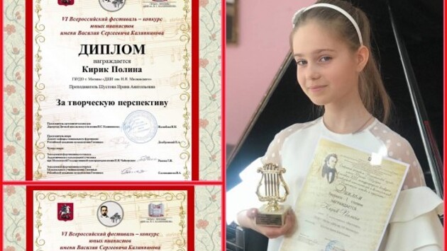 На открытом фестивале романтической музыки им. Ф. Шуберта девочка получила I место, а на всероссийском фестивале-конкурсе им. В.С. Калинникова - II место и специальный диплом «За творческую перспективу».