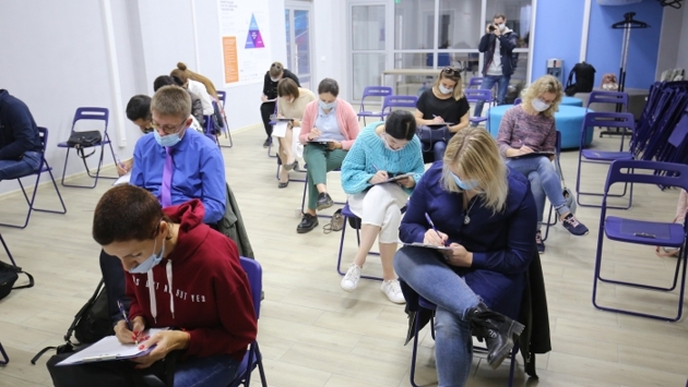 В «Точке кипения» сегодня собрались 50 добровольцев. Это люди разного возраста и профессий – те счастливчики, кому удалось зарегистрироваться первыми на очный диктант. Они-то и писали диктант в аудитории, количество мест в которой было ограничено. Все надели защитные маски. На свои стулья рассаживались, соблюдая социальную дистанцию.