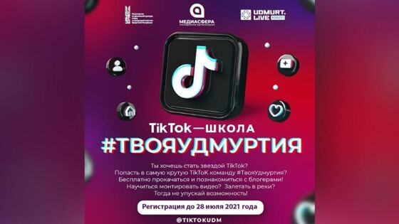Жители республики могут обучиться в первой в регионе TikTok школе #ТвояУдмуртия (16+). Об этом сообщает пресс-служба общественной организации «Атмосфера». По словам организаторов, медиа-школа будет работать по 1 ноября 2021 года и объединит на своей площадке молодежь от 16 до 35 лет Проект нацелен на создание позитивной повестки в TikTok (16+) посредством вовлечения 500 молодых человек, обучения 25 участников и организации команды популярных блогеров из 15 человек. Зарегистрироваться на участие в проекте можно по 28 июля 2021 года Путем конкурсного отбора организаторы выберут 25 человек, которые пройдут очный курс в медиа-школе, все остальные желающие смогут стать участниками тематических мастер-классов. Идея проведения проекта родилась еще во время карантина, когда TikTok стал популярной социальной сетью. Сейчас молодежь смотрит там за молодыми блогерами, хочет быть частью TikTok House и повторят их челленджи. Проект поможет создать в Удмуртии свою команду молодых блогеров, которые станут кумирами нашей молодежи Мария Созыкина, председатель молодежной организации «Атмосфера» На базе медиа-центра «Эктоника» пройдут по три лекционных и практических занятия. Занятия проведут: блогер, модель, автор блога о жизни в Удмуртии Вера Трефилова; автор обучающих курсов по съемке видео и фото на телефон Петр Спицын; тиктокер из Ижевска, ведущая свадеб и организатор Юлия Нуриева. Победители проекта смогут посетить TikTok Party известного певца и тиктокера Егора Шипа (16+). Информацию уточняйте по телефону: 8 (912) 467-71-11.