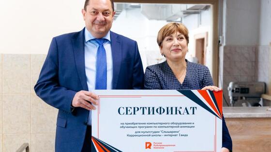 В честь праздника РРПК подарила школе сертификат на покупку нового компьютерного оборудования, обучающих анимационных программ, а также большой праздничный торт.