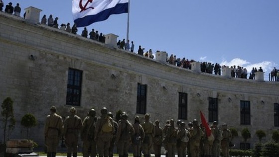 После показа военно-исторической реконструкции состоялось торжественное поднятие ВМФ СССР под исполнение гимна России оркестром ЧФ.