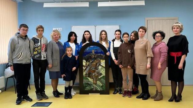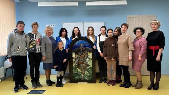 Витраж, собранный по картине Павла Рыженко «Победа Пересвета», активистки движения расписывали вручную. Копия знаменитого полотна займет свое место в школе № 65 города Мариуполя, которая открылась после восстановительных работ 1-го сентября. «Я рада, что светлый образ монаха, прославленный в веках, займет свое место в школе, где дети снова могут учиться на родном языке, изучать свою историю, помнить и чтить настоящих героев», – отметила участница движения Елена Иваненко. Фото: представители движения «Катюша»
