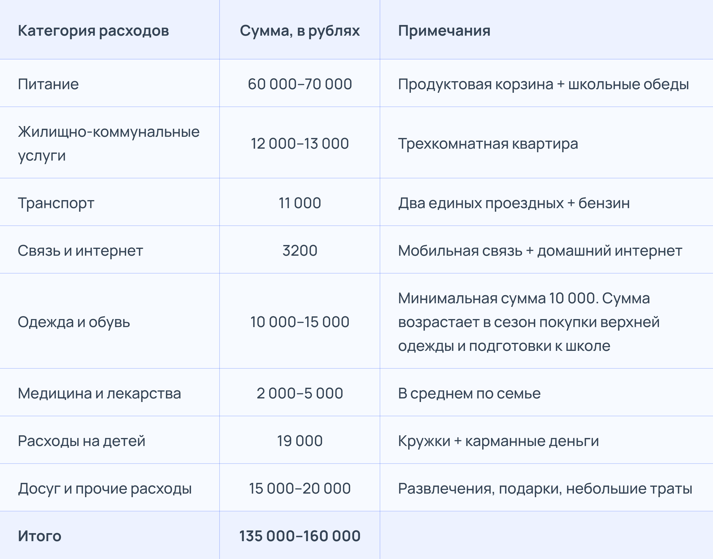 Если сложить все перечисленные категории, ежемесячные расходы нашей семьи из четырёх человек составляют в среднем от 135 до 160 тысяч рублей. Приведём расчёт в виде таблицы: