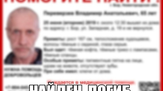 Пропавший в городе Бор Нижегородской области Владимир Переверзев найден погибшим. Об этом сообщается на сайте поисково-спасательного отряда «Волонтер». Напомним, что 65-летний мужчина пропал 25 июня текущего года. В тот день он вышел в неизвестном направлении из дома, расположенного на улице Западной. Домой пенсионер не вернулся и на связь не выходил. «Найден. Погиб. Выражаем соболезнования родным и близким погибшего», - говорится в сообщении на сайте ПСО «Волонтер».