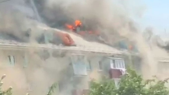 Местные жители делятся в Сети видеозаписями увиденного. На кадрах видно, как огонь масштабно полыхает на кровле здания.