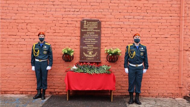 На табличке перечислены фамилии трех пожарных - старших прапорщиков Анатолия Жалнерчика и Алексея Пузырёва, а также сержанта Максима Рябцева. Пожарные отправились в задымленное здание искать оставшегося там грузчика, но у них закончился воздух. Посмертно их наградили Орденами Мужества.