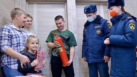 Потом офицеры дарят специальные средства и обращают внимание родителей на то, что огнетушитель лучше работает против возгораний мягкой мебели.