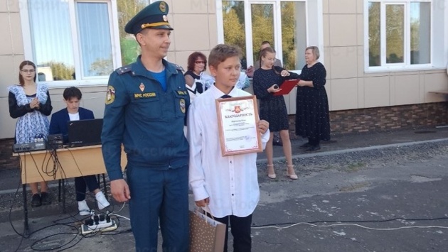 На школьной линейке мальчику вручил благодарственное письмо главы регионального МЧС Валерия Синькова начальник 138 пожарно-спасательной части Александр Барило. Такое же письмо подготовлено для спасителя пенсионера Эльдара Мамедова.
