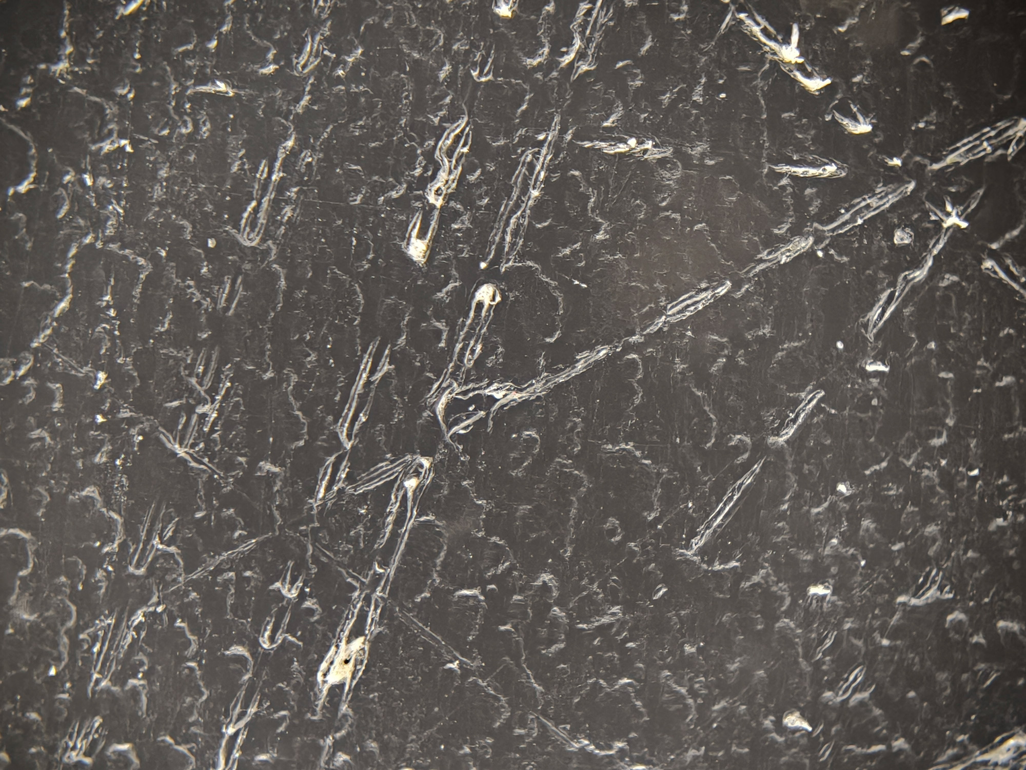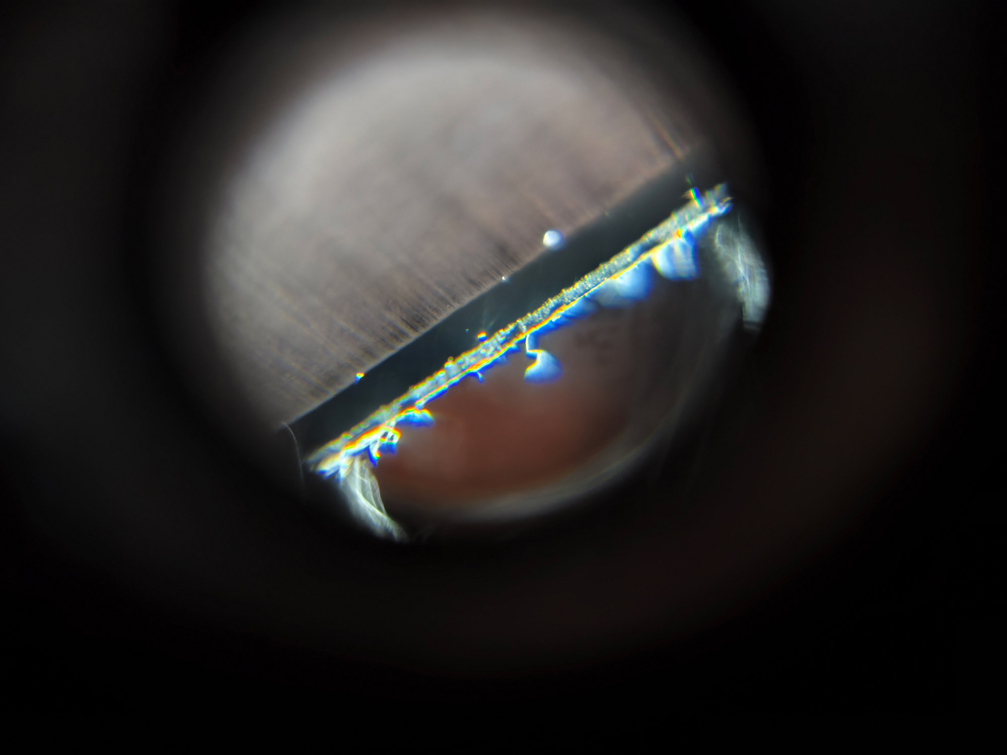Так выглядит лезвие ножа на микроскопе, который купил мой знакомый. Дешёвая модель не позволила получить кадр приемлемого качества.