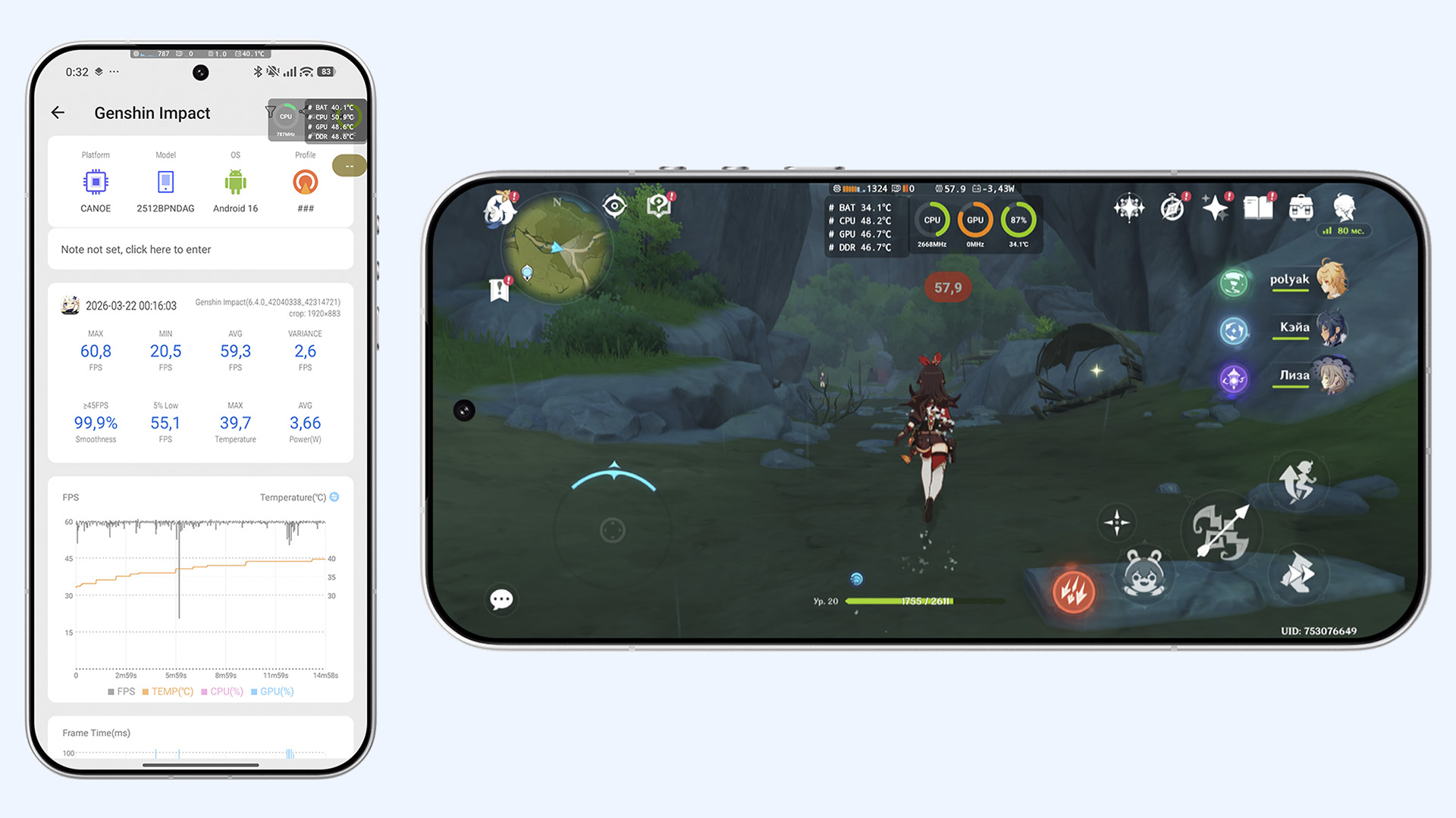 Такой нагрев я смог получить только в бенчмарках, тогда как в играх устройство остаётся едва тёплым. За 15 минут беготни в Genshin Impact и 10 минут перестрелок в Rainbow Six Siege Mobile смартфон не нагрелся выше 40 градусов, оставаясь вполне комфортным для рук. FPS при этом всегда стабильный: в Genshin частота кадров в среднем держится на уровне 59 FPS. В менее требовательной Rainbow Six вообще не проседает.