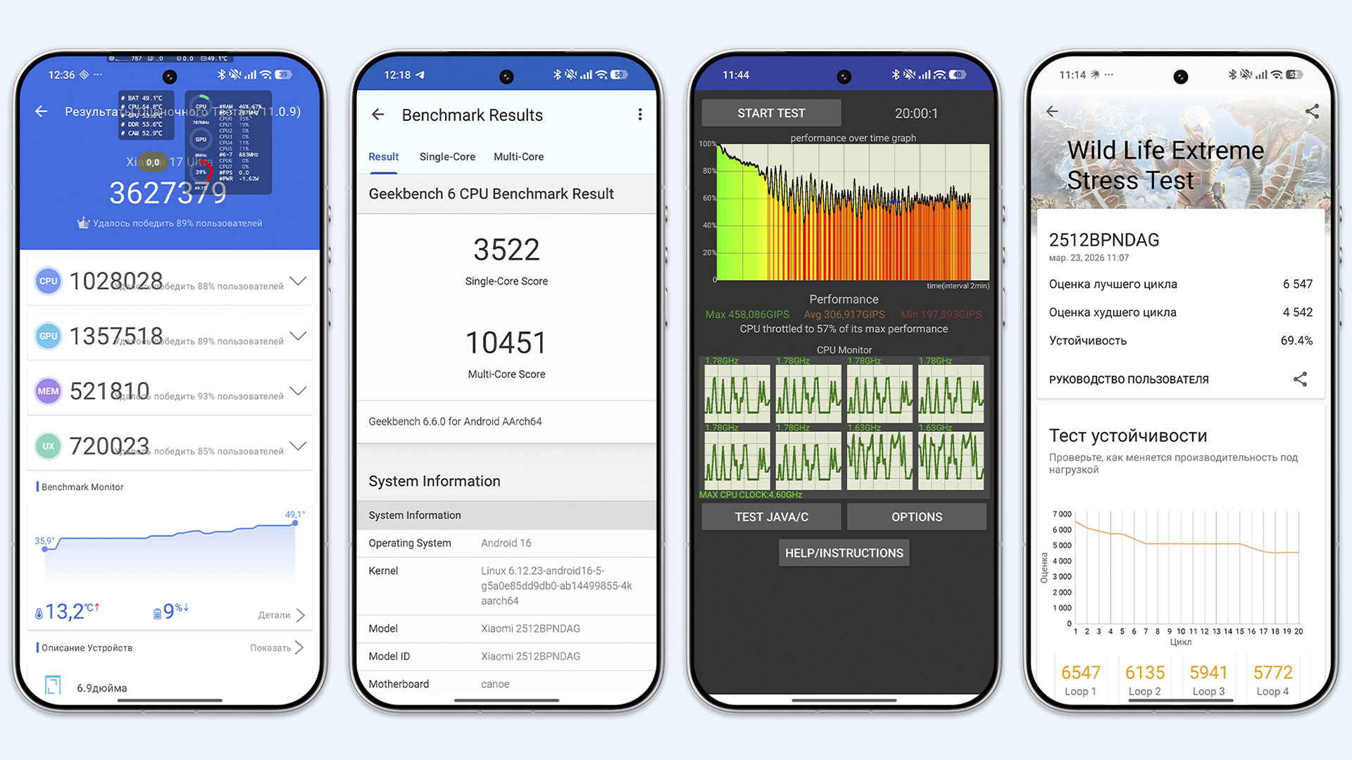 В бенчмарках всё ожидаемо: в AnTuTu 11 новинка легко переходит рубеж в 3,5 миллиона баллов, а в Geekbench 6 смартфон выбивает 3 522 балла в одноядерном и 10 451 балл в многоядерном тестах. В CPU Throttling Test телефон теряет до 43% производительности, а в 3DMark — 30%. Датчик температуры в области батареи прогревается до 50 градусов — это много, и это ощущается. Пальцы не обжигает, держать смартфон всё ещё можно.