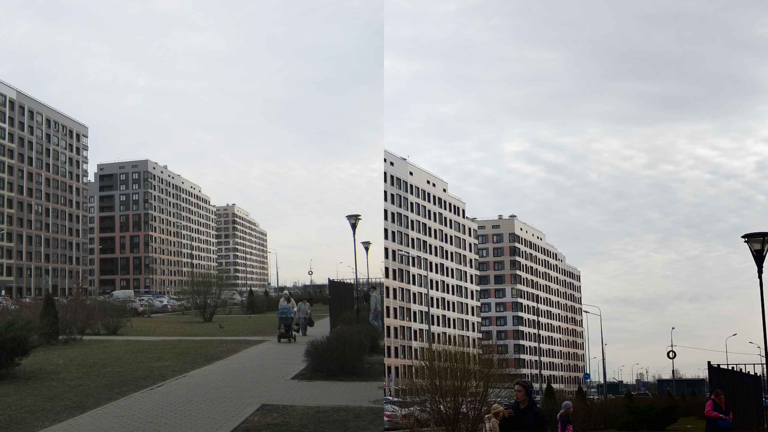 В первую очередь протестировал классический городской пейзаж в пасмурную погоду. На «мыльницу» получился довольно атмосферный, но технически слабый снимок: небо без текстуры, контраст минимальный, а общая цветопередача выглядит блёклой и «пыльной». Смартфон же отработал ожидаемо: цвета фасадов сочные, резкость хорошая и видна текстура облаков. Но камера точнее передала геометрию: обратите внимание, как изогнулся фонарь на фото со смартфона, в то время как «мыльница» сохранила кадр без искажений.