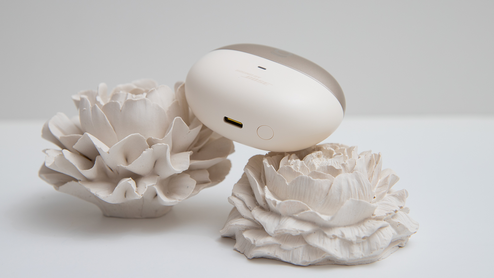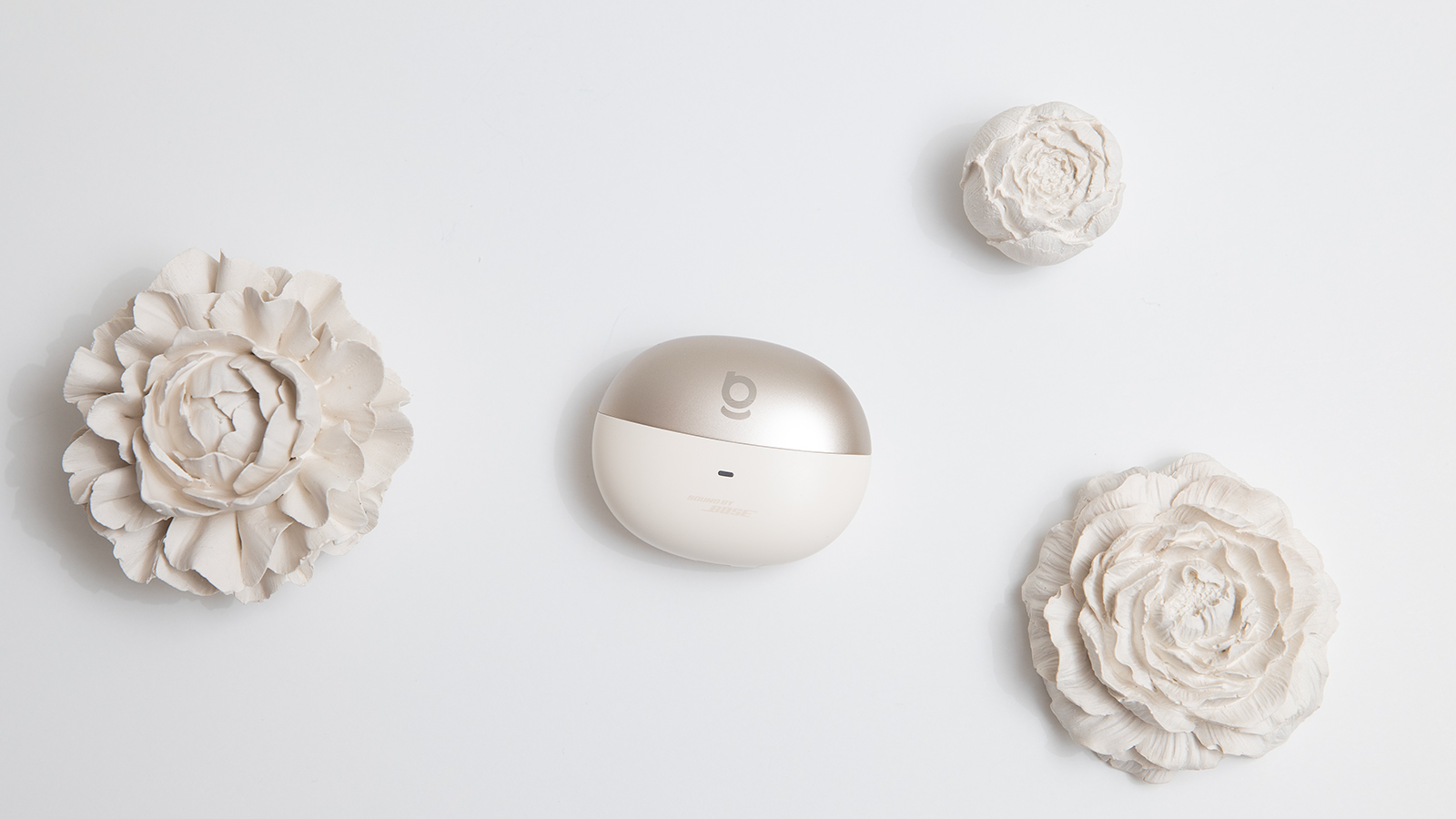 У Baseus Inspire XC1 лаконичный комплект, ведь их конструкция не предусматривает амбушюров. Поэтому в коробке только кейс с наушниками, кабель для зарядки и документация. Модель выпускается в светлой и тёмной расцветках, у меня на обзоре первая. Пластиковый кейс выглядит стильно благодаря двухцветному оформлению: нижняя часть светло-кремовая, а у крышки золотистый оттенок. Немного выбивается из стиля лишь надпись Sound by Bose — я предпочитаю, когда на корпусе гаджетов нет лишних надписей и логотипов.
