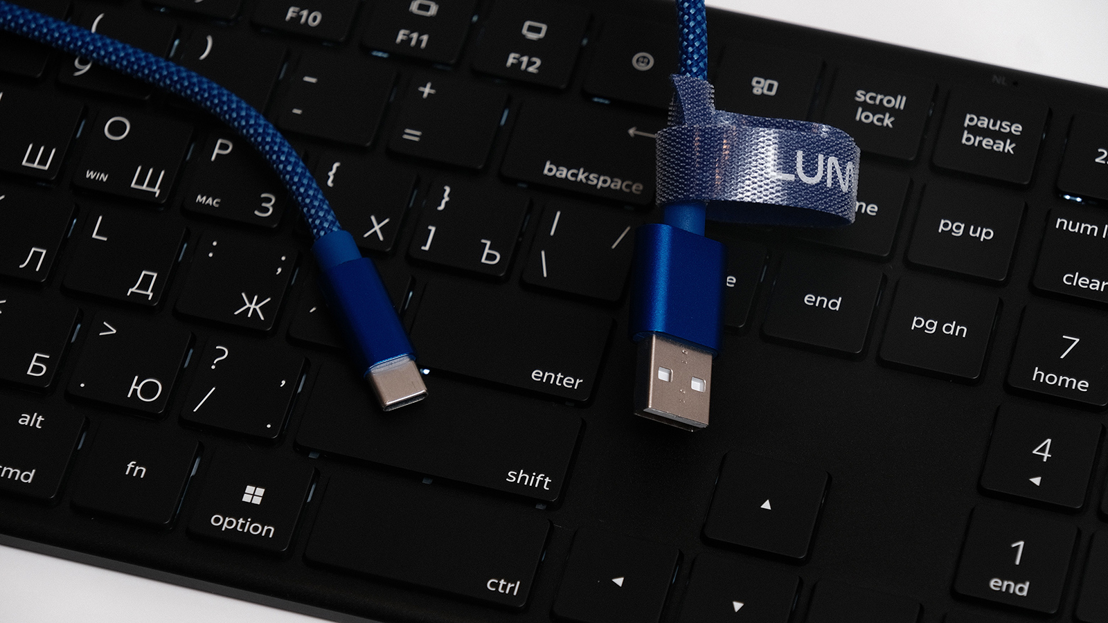 В комплекте с клавиатурой качественный кабель для зарядки в оплётке и с липучкой для удобного хранения. Синий цвет меня не смутил — это фирменная расцветка бренда Lunnen. Также присутствует приёмник 2.4G. Ещё в коробке лежит наглядная русскоязычная инструкция с цветными иллюстрациями — Яндекс Фабрика постаралась сделать настройку и эксплуатацию клавиатуры понятной.