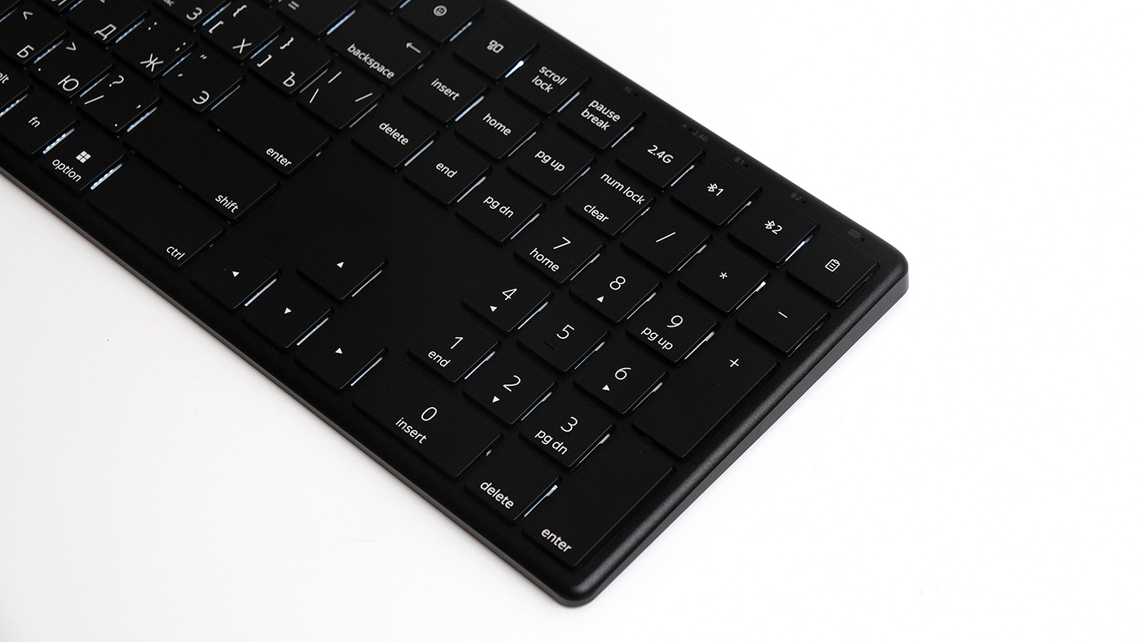 Есть возможность переключаться между разными устройствами — для быстрой смены есть две клавиши с логотипами Bluetooth над цифровым блоком. Мне эта функция не очень важна. Но если вы хотите по очереди печатать за ПК и планшетом, то оцените возможность лёгкой смены гаджетов без необходимости каждый раз привязывать клавиатуру к другому устройству.