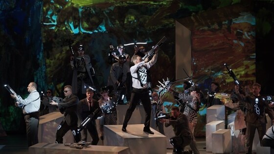 Опера "Фрейшютц" Вебера, первое представление которой состоялось ровно 200 лет назад в Берлине, на днях была показана в режиме gameplay на сцене Музыкального театра Станиславского и Немировича-Данченко. Наш академический Стасик вышел за свои академические рамки и вывел на сцену веберовских героев в роли современных геймеров, которые "залипают" в разрабатываемой ими компьютерной игре. Немецкий романтическо-мистический сюжет Иоганна Августа Апеля, положенный в основу оперы, позволил обыграть в режиссерской концепции Александра Тителя идею "выживания" героев в подстерегающих их опасностях, характерную для многих видеоигр. Здесь произошло полное совпадение оригинала и сценической версии. Действие оперы перенеслось в наши дни. Место событий - компания, разрабатывающая компьютерные игры. Оригинальная сюжетная линия Вебера-Апеля стала принадлежностью виртуального игрового мира, который тестируют разработчики, они же герои оперы. Фото: Сергей Родионов. Пресс-служба МАМТ Безусловно, не обошлось без некоторых изменений в разговорных диалогах между музыкальными номерами. Это органично вписалось в сам жанр зингшпиля, к которому относится "Вольный стрелок". Действие на сцене перемежается, происходя, то в оффисе компании, то в игровом режиме компьютерного сеанса. Хор, массовка на сцене надевали очки и шлемы виртуальной реальности. Задник сцены - монитор компьютера, игровое поле в условном историческом антураже. (Правда, очень красочный двигающийся фон видеоряда "высокого разрешения" утомлял глаза.) Трансформеры, появляющиеся на сцене в момент игры геймеров, напоминали образы многих видеоигр-стрелялок, а для разворачивающегося параллельно оригинального сюжета символизировали мир злого духа Самиеля. "Разработчики" оперной игры, создатели спектакля позаботились о понимании зрителем происходящего на сцене, подробно расчертив в программке две сюжетные канвы. К слову отметить, программка, ее содержание и оформление заслужили множество комплиментов: интересные факты, историко-биографические таблицы, мысли великих людей, рассуждения об искусственном интеллекте и весь просветительско-исследовательский тон подачи материала. Музыка Вебера под рукой маэстро Фабриса Боллона звучала безупречно выверенно по всем параметрам. Сиюминутные отсебятины, жирные мазки, "общие" места отсутствовали в игре оркестра. Аккуратность, почти педантичность, все же не мешали высветить звукоизобразительность веберовской музыки, налет раннего романтизма. Фото: Сергей Родионов. Пресс-служба МАМТ Самый знаменитый хор "Песня подружек или Девичий венок", который еще 200 лет назад влюбил в себя всех и вся, как и мужской хор охотников, по воле режиссера и художников постановки единственные исполнялись в исторических национальных костюмах. Вероятно, весь оффис затянуло в игру. Смотрелось неожиданно и красиво, было эффектно и прекрасно исполнено. Выразительный и переливчатый тембр голоса Нажмиддина Мавлянова был украшением его героя Макса и приятностью для зрительского слуха. Для всех солистов, видимо, главной трудностью был сам стиль Вебера - бесконечные музыкальные формулы арпеджио, как, что называется, по школе и немецкий язык. Роман Улыбин (Куно) был, как всегда, артистичен, иронично комментируя происходящее. Евгения Афанасьева (Энхен) мило изображала легкомыс