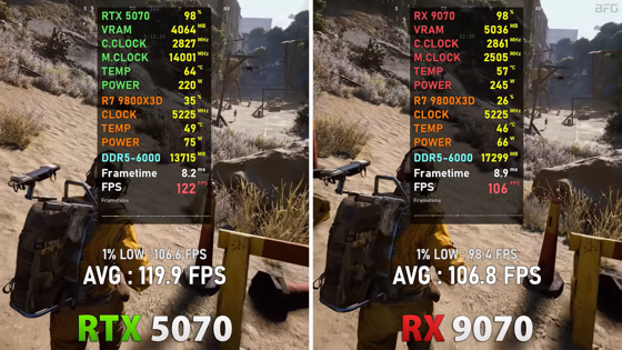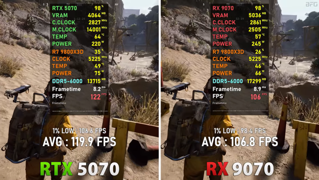 Battlefield 6 шла с пресетом Overkill, DLSS 4/FSR 4 Quality. Средняя частота кадров составляла в игре 111 к/с (5070) и 115 к/с (9070).