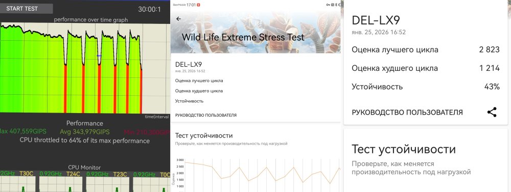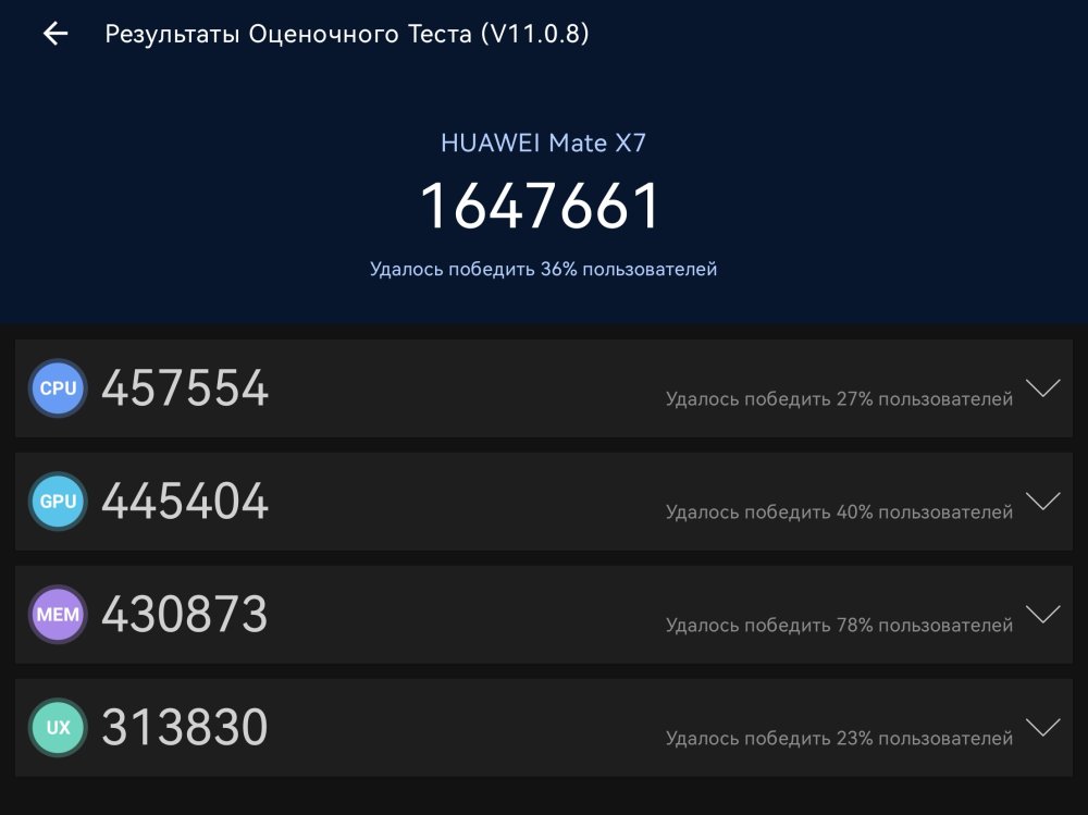 В получасовом CPU Throttling Test производительность Mate X7 упала до 64% от максимума. Не сногсшибательный показатель, но очень неплохо. А вот устойчивость при длительных нагрузках в Wild Life Extreme Stress Test показывает 47,8% с оценкой худшего цикла 1349 баллов. Ну… такое. У того же OnePlus 15 было 74,2% и 5466 баллов соответственно. Но надо все же понимать, что синтетические тесты, имитирующие максимальные нагрузки, в реальной жизни встречаются только в играх. За 10 дней тестирования устройства 99% задач, с которыми сталкиваются пользователи, выполнялись максимально быстро без нагрева и лагов.