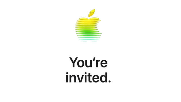 В приглашении событие обозначено как «эксклюзивное мероприятие Apple Experience» – без уточнений о программе. На карточке изображён объёмный логотип Apple, составленный из жёлтых, зелёных и синих кругов.