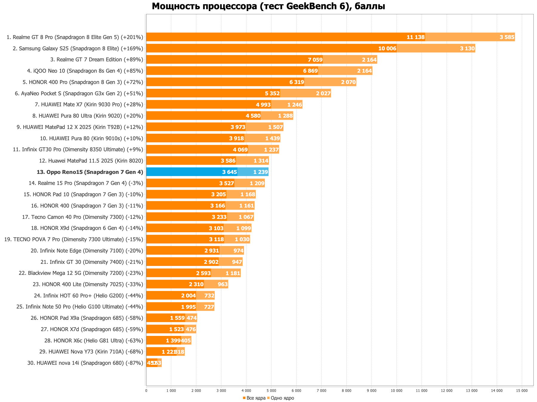 В AnTuTu v10 Reno15 набирает около 1 087 000 баллов, в v11 — уже свыше 1 400 000. В Geekbench 6 — 1188 баллов в однопоточном тесте. Для понимания: это уровень, при котором можно одновременно держать открытыми десяток приложений, монтировать короткие видео и не замечать задержек в интерфейсе. Это не территория флагманов, где Snapdragon 8 Elite набирает по три миллиона в AnTuTu, — но для задач 95% пользователей разница будет чисто академической.
