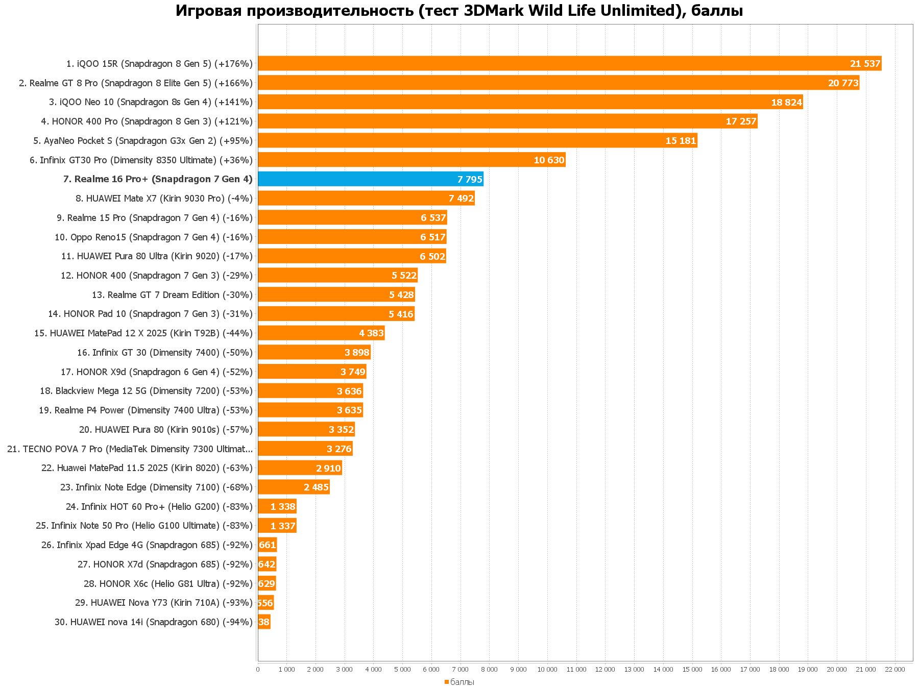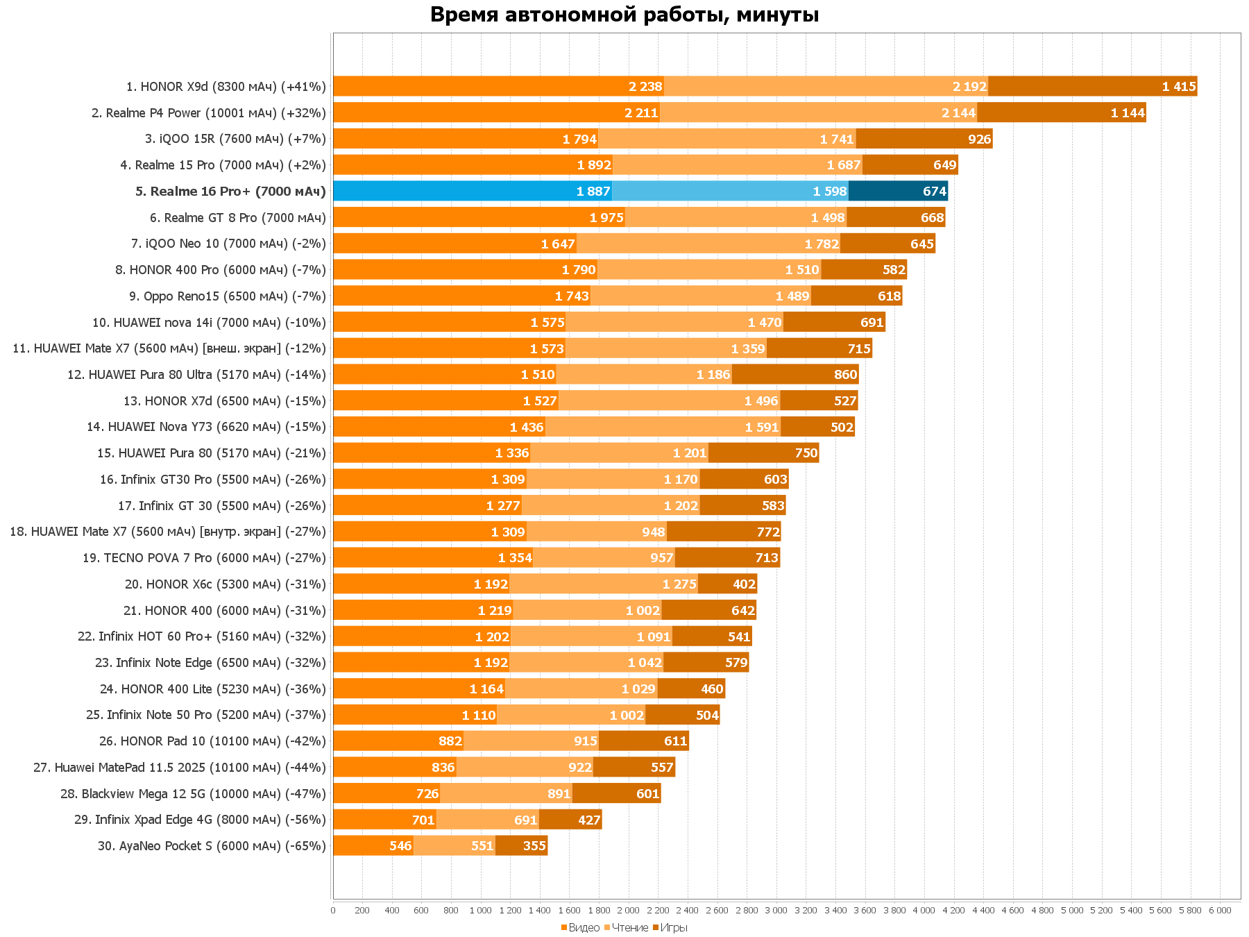 7000 мАч при яркости 200 кд/м2 (примерно 2/3 от всей ширины ползнука в настройках) хватает на 31 c лишним час просмотра видео и фильмов, чтения книг на протяжении 26 с половиной часов и 11 часов игры в требовательный Genshin Impact от вайфая. Короче, если вы скачете от розетки к розетке со своим новеньким Pixel 10 (как автор обзора) или 17 Pro Max из-за зависимости от соцсетей, то Realme 10 Pro+ вам точно хватит на большее время.