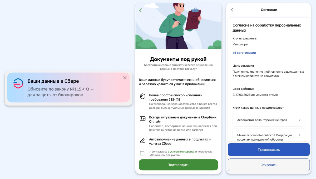 Банки стали активно присылать пользователям пуши и сообщения с просьбой обновить данные через Госуслуги в соответствии с законом № 115-ФЗ («О противодействии легализации (отмыванию) доходов, полученных преступным путём, и финансированию терроризма»).