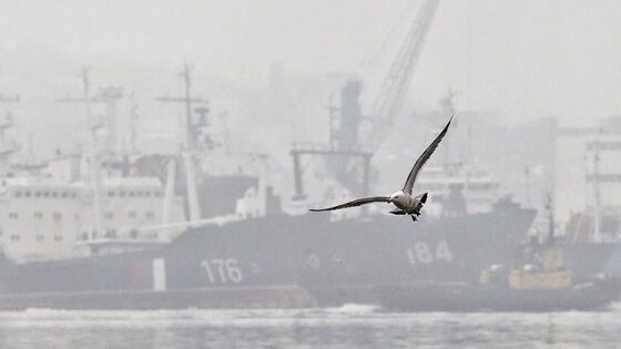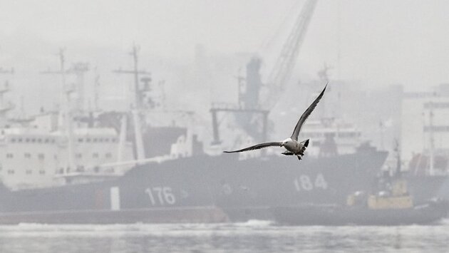 Спасатели обследуют рыболовецкий сейнер, горевший в Охотском море