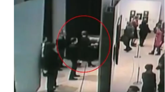 На кадрах видно, как похититель подходит к стене, снимает картину и скрывается в неизвестном направлении.