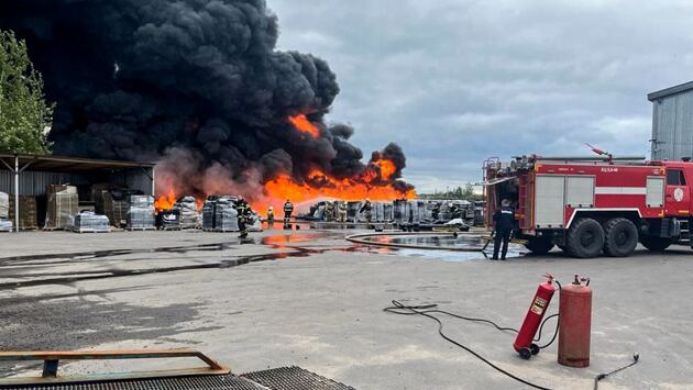 Пожарные ликвидируют возгорание и препятствуют распространению огня на соседние здания. Горят складское помещение и деревянные паллеты на открытой площадке.