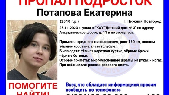 13-летнюю Екатерину Потапову разыскивают в Нижнем Новгороде. Об этом сообщили в поисково-спасательной группе «Рысь». 28 ноября девочка ушла из Детского дома №3 на Анкудиновском шоссе и с тех пор не вернулась. Школьница имеет среднее телосложение, рост 160 см, темные короткие волосы и голубые глаза. На руках и ногах у нее многочисленные шрамы. На момент пропажи была одета в темную короткую куртку, черные брюки и ботинки, с собой был розовый рюкзак. Ранее на сайте pravda-nn.ru сообщалось, что полиция разыскивает 14-летнего мальчика, пропавшего в Урене.