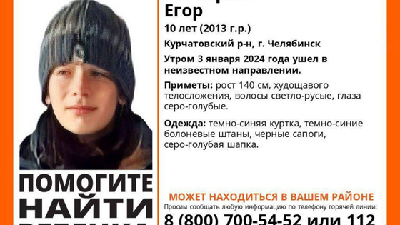 «В Курчатовском районе Челябинска пропал мальчик десяти лет Егор Захаров. Он ушел в неизвестном направлении утром 3 января», — сообщили в официальном паблике поискового отряда в соцсети «ВКонтакте».