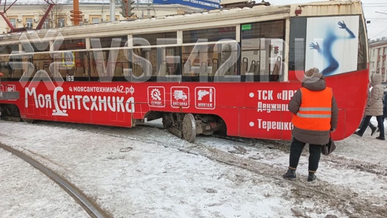 Трамвай сошел с рельсов на оживленном перекрестке в Кемерове