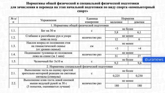 <p style="text-align:justify">Министерство спорта РФ опубликовало проект нового стандарта физической подготовки для киберспортсменов, который может вступить в силу с 1 января 2026 года. Документ заменит две предыдущие версии, которые не были утверждены.</p> <p style="text-align:justify">Согласно проекту, для получения квалификации спортсменам в дисциплине «Компьютерный спорт» придётся сдавать ряд физических нормативов:</p> <p style="text-align:justify">- бег на 30 метров,</p> <p style="text-align:justify">- отжимания от пола,</p> <p style="text-align:justify">- челночный бег (3 подхода по 10 метров),</p> <p style="text-align:justify">- упражнения на пресс,</p> <p style="text-align:justify">- а также специальный "клик-тест" — за 30 секунд необходимо нажать левой кнопкой мыши не менее 180 раз ведущей рукой.</p> <p style="text-align:justify">Новый стандарт направлен на то, чтобы сформировать единые требования к физической подготовке в киберспорте как официальном виде спорта.</p> <p style="text-align:justify">В настоящее время проект проходит процедуру общественного обсуждения и согласования.</p> <p style="text-align:justify">Фото: URA.RU.</p>