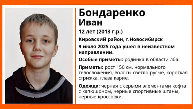 В Кировском районе Новосибирска без вести пропал 12-летний Иван Бондаренко. Как сообщили в поисково-спасательном отряде (ПСО) «ЛизаАлерт», 9 июля 2025 года он ушел в неизвестном направлении, поэтому на поиски отправилисб волонтеры.