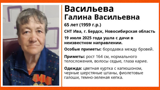 В садовом товариществе Ива города Бердска под Новосибирском без вести пропала 65-летняя Галина Васильева. Как сообщили в поисково-спасательном отряде (ПСО) «ЛизаАлерт», 19 июля 2025 года она ушла с дачи в неизвестном направлении, поэтому к поискам подключились волонтеры.