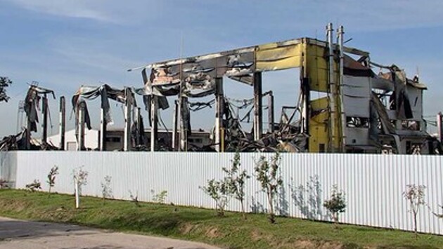 Огонь охватил 12 тысяч квадратных метров. В ходе пожара частично обрушилась конструкция здания. В тушении участвовали два вертолета спасателей, они сбросили 40 тонн воды за 13 полетов.