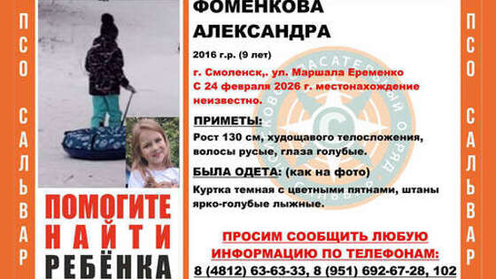 В Смоленске ищут девятилетнюю школьницу, которая утром 24 февраля ушла гулять с собакой и не вернулась. Мэр Смоленска Александр Новиков в своем Telegram-канале призвал возможных очевидцев откликнуться. "Обращаюсь ко всем, кто находился в это время там или проезжал мимо: пожалуйста, проверьте записи видеорегистраторов, вспомните, не видели ли вы этого ребенка. Даже самая незначительная на первый взгляд деталь может оказаться важной", — сообщил градоначальник. Ребенка в последний раз видели около 8:00 на улице Маршала Еременко в районе домов 58 и 60. Девочка была одета в темную куртку с цветными пятнами и ярко-голубые лыжные штаны . Приметы: рост 130 см, худощавого телосложения, волосы русые, глаза голубые. Школьница вышла из дома утром 24 февраля, чтобы выгулять собаку. По данным Telegram-канала "112", несовершеннолетнюю могли увезти на автомобиле в неизвестном направлении. Возбуждено уголовное дело.