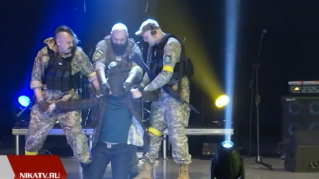 При этом люди соружием исукраинской символикой вышли взал, навидео зрители удивлены, одна иззрительниц кричит «отпустите» и«больно». Врепортаже журналистка Екатерина Родина говорит, что артисты изЛуганской народной республики использовали охолощенное оружие инастоящую военному форму.