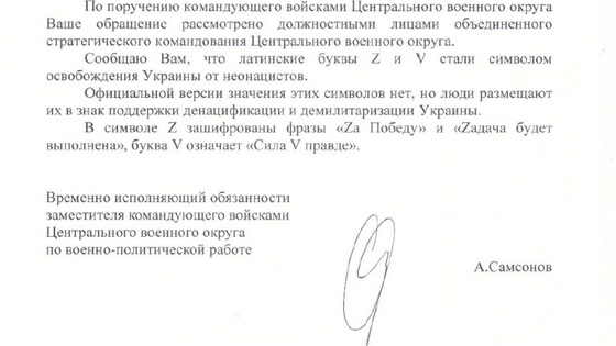«Сообщаю вам, что латинские буквы Z и V стали символам освобождения Украины от неонацистов. Официальной версии значения этих символов нет, но люди размещают их в знак поддержки денацификации и демилитаризации Украины. В символе Z зашифрована фраза „Zа Победу“ и „Zадача будет выполнена“, буква V означает „Сила V правде“», — говорится в ответном письме ведомства. Документ опубликован в telegram-канале Галицкого.