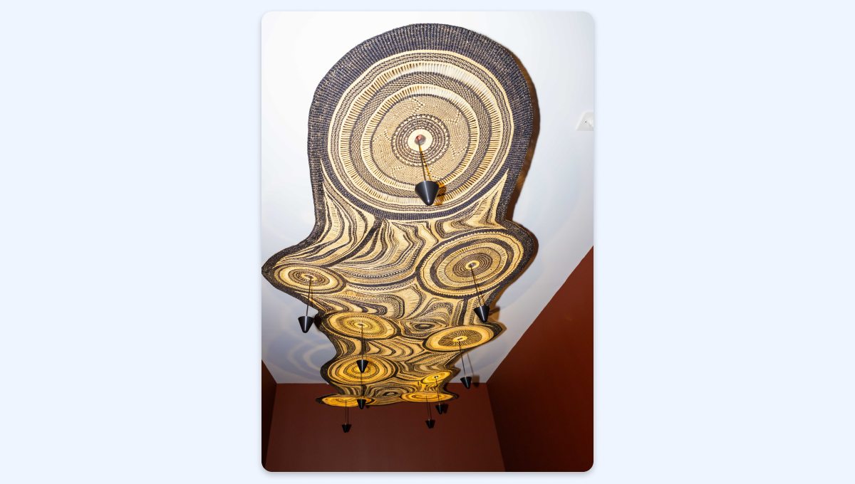 На фото — подвесная композиция-люстра из натуральных волокон. Этот объект объединяет традиционное ремесло и современный подход к освещению. Плетёная структура, напоминающая разрез древесных колец или традиционные бабушкины коврики, превращена в потолочное полотно, через которое мягко проходит свет.